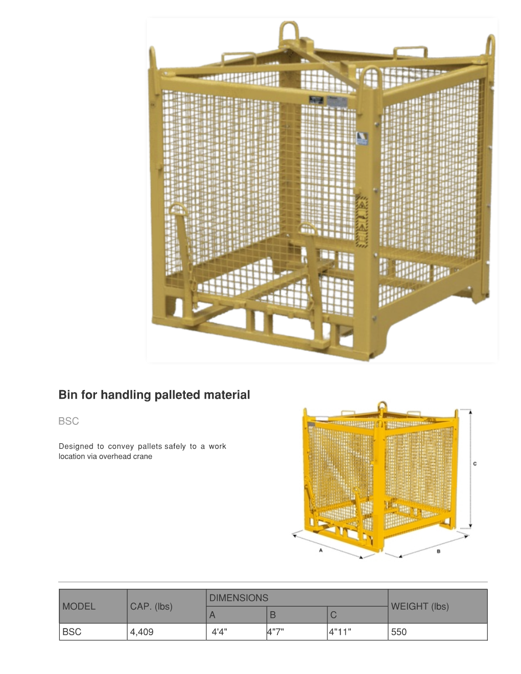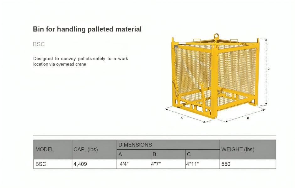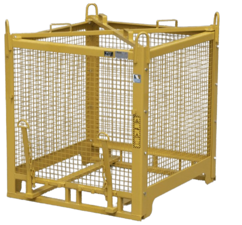 Our palletized handling cage has been designed with both safety and efficiency in mind. This basket allows you to safely move pallets from point A to point B, whilst simultaneously mitigating the risks associated with materials falling from the suspended pallet. To use the basket, you must remove the two forks/pins from the bottom of the basket, once they have been removed you can then lower the basket over the pallet you are planning on lifting. Once the basket touches down, you would then reinsert the forks and safety clips. At this point, the pallet is secured to (and contained inside) the cage and you can hoist the pallet as a single unit. This is a fully collapsible item, which allows for